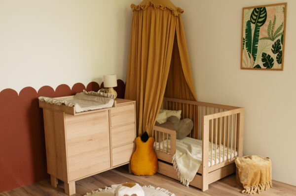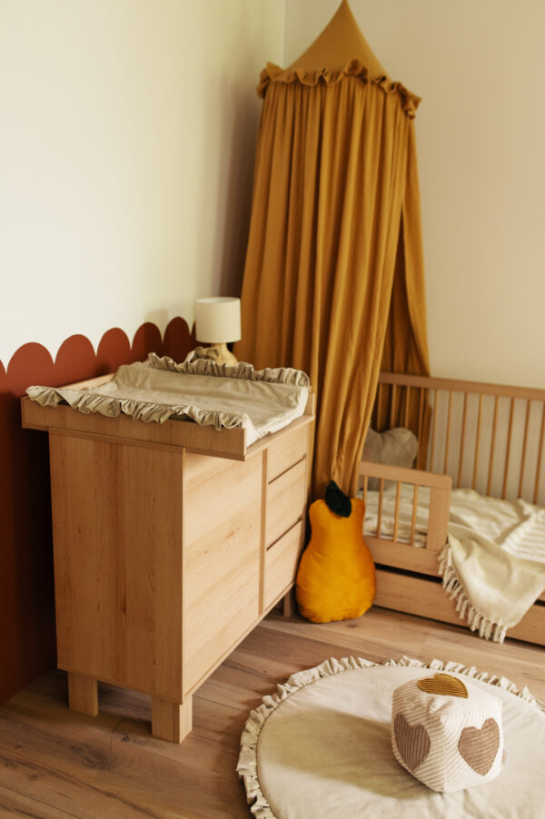 Z myślą o rodzicach, komodę OLIVIA można wzbogacić o specjalną nakładkę do przewijania, która jest montowana na boku. Dzięki temu zyskujesz dodatkowe miejsce na przewijanie, a jednocześnie zachowujesz łatwy dostęp do wszystkich szuflad. To idealne rozwiązanie dla małych przestrzeni!